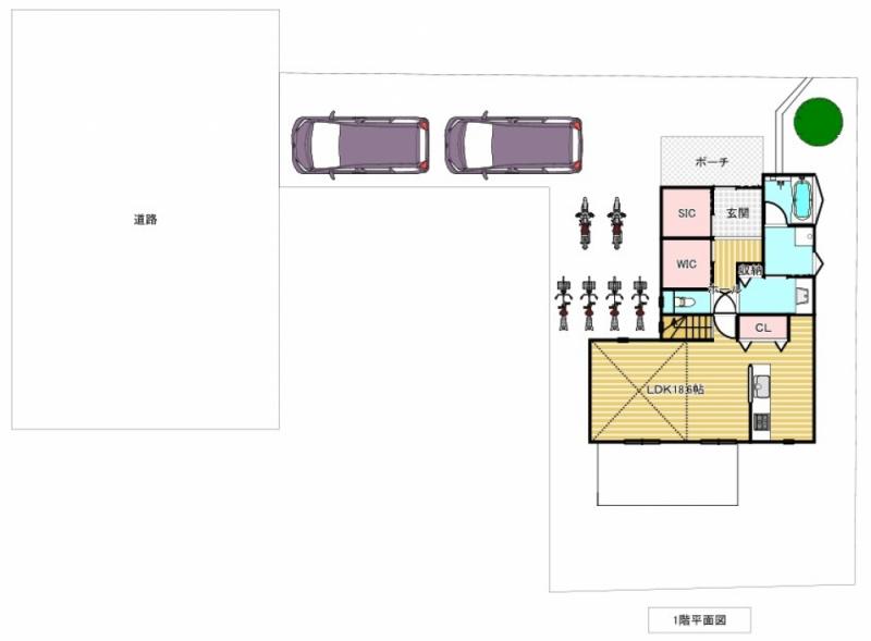 法制限:約西7.2m公道(法42条1項1号)第1種住居専用地域、防火地域 60% 300%